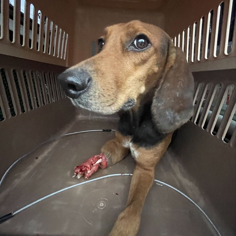 2021 救援的 Hearty,是山豬吊的受害者,三週後成功保住腳,不用截肢。