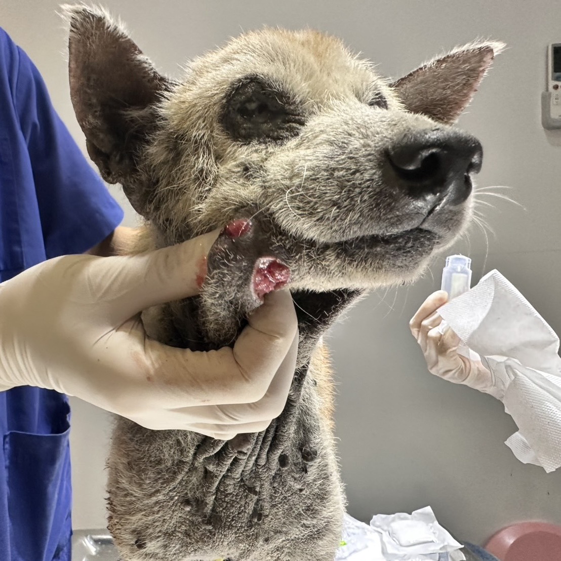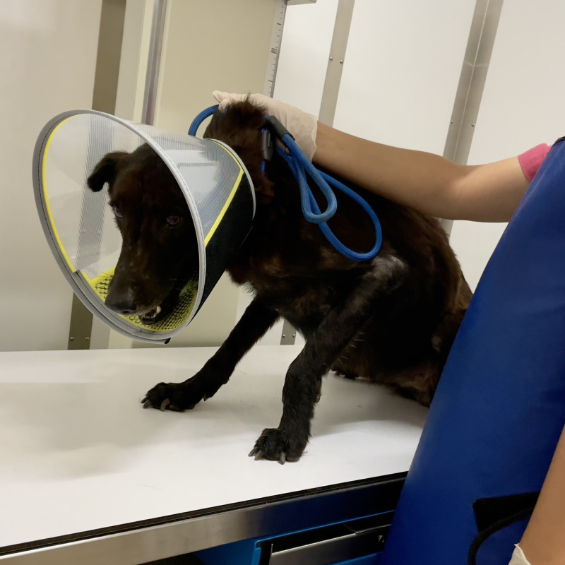 10/21 在桃園蘆竹的工寮倉庫救援的Ame, 皮膚、精神狀況不樂觀。但到醫院還是很乖的忍著不舒服給醫生檢查: